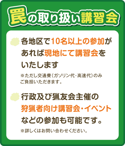 | 事業内容 | 猪(イノシシ)や鹿(シカ)など狩猟用罠の製造販売 |
